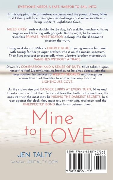Everyone needs a safe harbor to sail into. In this gripping tale of mystery, suspense, and the power of love, Miles and Liberty will face unimaginable challenges and make sacrifices to bring justice to Lighthouse Cove. Miles Kirby leads a double life. By day, he's a skilled mechanic, fixing engines and tinkering with gadgets. But by night, he becomes a relentless private investigator, delving into the shadows to uncover the truth. Living next door to Miles is Liberty Blue, a young woman burdened with caring for her younger brother, who is on the autism spectrum. Their lives intersect unexpectedly when Liberty's brother mysteriously vanishes without a trace. Driven by compassion and a sense of duty, Miles takes it upon himself to find Liberty's missing brother. As he dives deeper into the investigation, he uncovers a web of secrets and dangerous connections that threaten to unravel the very fabric of Lighthouse Cove. As the stakes rise and danger lurks at every turn, Miles and Liberty must confront their fears and face the truth that sometimes, the ones we trust the most may be hiding the darkest secrets. In a race against the clock, they must rely on their wits, resilience, and the unexpected bond that forms between them.