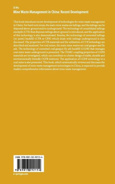 This book introduces recent development of technologies for mine waste management in China. For hard rock mines, the main mine wastes are tailings, and the tailings can be disposed above-ground and/or underground. The technology of consolidated tailings stockpile (CTS) that disposes tailings above-ground is introduced, and the application of this technology is also demonstrated. Besides, the technology of cemented tailings (or paste) backfill (CTB or CPB) which deals with tailings underground is also discussed. The properties of CTB materials and the utilization of CTB technology are described and analyzed. For coal mines, the main mine wastes are coal gangue and fly ash. The technology of cemented coal gangue-fly ash backfill (CGFB) that manages coal mine waste underground is presented. The THMC coupling properties of CGFB materials are investigated, which can contribute to a better design of stable, durable and environmentally friendly CGFB mixtures. The application of CGFB technology in a coal mine is also presented. This book, which systematically reviews and discusses the development of mine waste management technologies in China, is expected to provide readers comprehensive information about mine waste management.