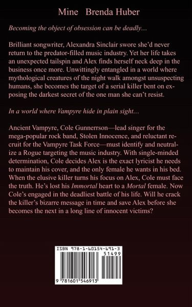 Becoming the object of obsession can be deadly. Brilliant songwriter, Alexandra Sinclair swore she'd never return to the predator-filled music industry. Yet her life takes an unexpected tailspin and Alex finds herself neck deep in the business once more. Unwittingly entangled in a world where mythological creatures of the night walk amongst unsuspecting humans, she becomes the target of a serial killer bent on exposing the darkest secret of the one man she can't resist. In a world where Vampyre hide in plain sight... Ancient Vampyre, Cole Gunnerrson-lead singer for the mega-popular rock band, Stolen Innocence, and reluctant recruit for the Vampyre Task Force-must identify and neutralize a Rogue targeting the music industry. With single-minded determination, Cole decides Alex is the exact lyricist he needs to maintain his cover, and the only female he wants in his bed. When the elusive killer turns his focus on Alex, Cole must face the truth. He's lost his Immortal heart to a Mortal female. Now Cole's engaged in the deadliest battle of his life. Will he crack the killer's bizarre message in time and save Alex before she becomes the next in a long line of innocent victims?