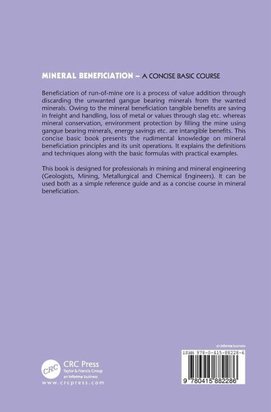 Beneficiation of run-of-mine ore is a process of value addition through discarding the unwanted gangue bearing minerals from the wanted minerals. Tangible benefits are savings in freight and energy, reduced loss of metal, mineral conservation, and less environmental burden by filling the mine using gangue bearing minerals. This concise book present the essentials mineral beneficiation principles and unit operations. It explains definitions and techniques, along with basic formulas and practical examples. A simple reference for students and professionals in mining and mineral engineering.