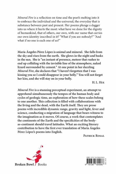 Mineral Fire is a reflection on time and the poet's melting into it to embrace the individual and the universal, the everyday that is substance between past and present. Her poems plunge a dagger into us where it hurts the most: what we have done for the dignity of humankind, that of others, our own, with our name that carries our own identity inscribed in it? "What if you are nobody?" "And what if no one is each one of us?" María Ángeles Pérez López is animal and mineral. She falls from the sky and rises from the earth. She glows in the night and basks in the sun. She is "an instant of presence, meteor that rushes to end up colliding with the invisible line of the atmosphere, naked lizard surrounded by cement." At one point in her dazzling Mineral Fire, she declares that "I haven't forgotten that I was kissing you so I could disappear in your belly." You will not forget her kiss, and she will stay on in your belly. H.L. Hix Mineral Fire is a stunning perceptual experiment, an attempt to apprehend simultaneously the tempos of the human body and cycles of geologic time, an exploration of how these scales belong to one another. This collection is filled with collaborations with the living and the dead, with the Earth itself. They are prose poems with incredible dynamic range, gravity and light, fever and science, conducting a migration of language that bears witness to the imagination as it moves. Of course, a work that contemplates the continents of the Earth and the specificities of the bodyas-continent should travel latitudes. What an exciting literary contribution to have the first ever translation of María Ángeles Pérez López's poems into English. Patrick Rosal