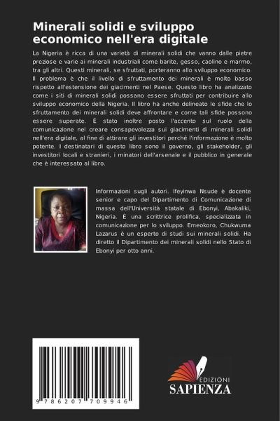 La Nigeria è ricca di una varietà di minerali solidi che vanno dalle pietre preziose e varie ai minerali industriali come barite, gesso, caolino e marmo, tra gli altri. Questi minerali, se sfruttati, porteranno allo sviluppo economico. Il problema è che il livello di sfruttamento dei minerali è molto basso rispetto all'estensione dei giacimenti nel Paese. Questo libro ha analizzato come i siti di minerali solidi possano essere sfruttati per contribuire allo sviluppo economico della Nigeria. Il libro ha anche delineato le sfide che lo sfruttamento dei minerali solidi deve affrontare e come tali sfide possono essere superate. È stato inoltre posto l'accento sul ruolo della comunicazione nel creare consapevolezza sui giacimenti di minerali solidi nell'era digitale, al fine di attirare gli investitori perché l'informazione è molto potente. I destinatari di questo libro sono il governo, gli stakeholder, gli investitori locali e stranieri, i minatori dell'arsenale e il pubblico in generale che è interessato al libro.