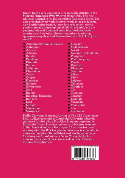 A statistical handbook covering over 46 minerals with the latest figures and prices. The data covered includes world reserves, mine and refining production, secondary production, reserve/production ratio, consumption of refined metal, end use patterns, marketing agreements and supply and demand.