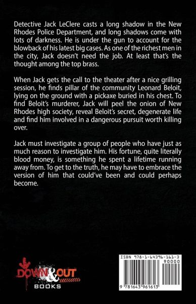 Jack LeClere is a cop dodging bullets in what could best be described as friendly fire. He took out the serial killer who murdered his parents, and half of New Rhodes paid the price. Not to mention the rioting that gripped the city over the Julia Mae Jefferson murder, his last big case. So in the spirit of the aftermath, his superiors have called into question every sliver of his conduct. Jack is wealthy; he doesn't need to be a detective, and the top brass are implying that maybe if he followed procedure like his livelihood depended on it, he wouldn't want to be a cop. Leonard Beloit is a pillar of the community and a very wealthy man also, which does him no good when Jack gets called to the Grand Royal Theater to find him on the floor, his chest pierced with a gem pickaxe. Jack's search for the person who killed Beloit starts with the search for the person who was Beloit. As he speaks with Beloit's wife and daughter and digs even further, Jack finds a lustful, vagrant degenerate that would be unrecognizable in the society pages. Gangs, petty crimes, and not-so-petty crimes seem to be Beloit's off-hours pastime. None of this would call for Beloit's death, but Jack will keep digging, and soon realize he is peeling into the rot of the onion of New Rhodes high society, of which he is a reluctant member. The deeper he gets investigating what his peers are doing in the shadows, the more they investigate him, asking, in their own way, whether he'll stop playing cop and do something with the vast inheritance he rarely uses, and claims to never want. Beloit's exploits take a very dangerous turn in the form of a conspiracy to transport toxic chemicals through the Adirondacks; it may be that the smoking gun is wrapped up in a smokestack. The case to find, and hold accountable, Beloit's killer will pit him against not only the killer, but a version of himself that it seems everyone around him sees, that perhaps he can't remain blind to anymore.
