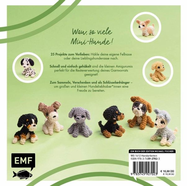 25 kleine Amigurumis zum Verlieben: Häkle deinen besten vierbeinigen Freund oder deine Lieblingshunderasse nachSchnell gemacht und einfach gehäkelt - die kleinen Projekte kannst du mit wenig Zeitaufwand herstellen, und sie sind perfekt für die Resteverwertung deines Garnvorrats geeignet!Zum Sammeln oder Verschenken, als Schlüsselanhänger oder Mobile - mit den kleinen Häkelstücken hundevernarrten Familienmitgliedern, Freund_innen und Kolleg_innen große Freude bereiten