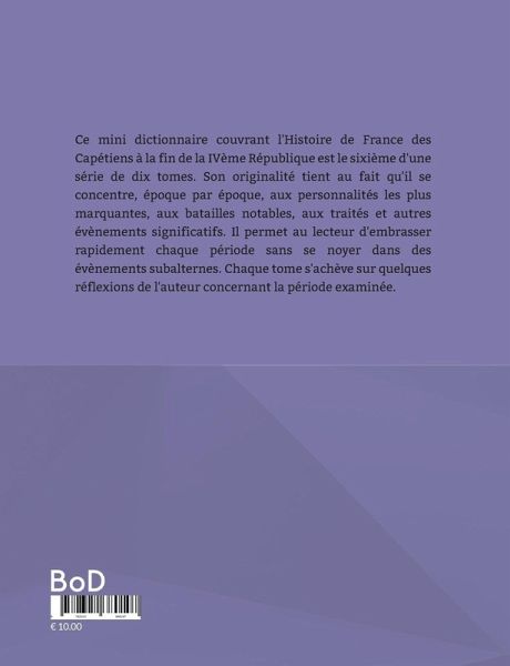 Ce mini dictionnaire couvrant l'Histoire de France des Capétiens à la fin de la IVème République est le sixième d'une série de dix tomes. Son originalité tient au fait qu'il se concentre, époque par époque, aux personnalités les plus marquantes, aux batailles notables, aux traités et autres évènements significatifs. Il permet au lecteur d'embrasser rapidement chaque période sans se noyer dans des évènements subalternes. Chaque tome s'achève sur quelques réflexions de l'auteur concernant la période examinée.