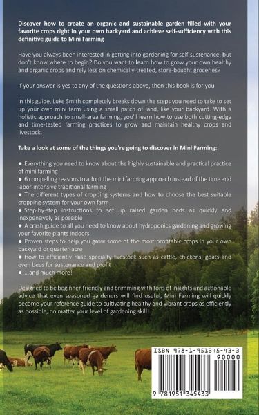 Discover how to create an organic and sustainable garden filled with your favorite crops right in your own backyard and achieve self-sufficiency with this definitive guide to Mini Farming Have you always been interested in getting into gardening for self-sustenance, but don't know where to begin? Do you want to learn how to grow your own healthy and organic crops and rely less on chemically-treated, store-bought groceries? If your answer is yes to any of the questions above, then this book is for you. In this guide, Luke Smith completely breaks down the steps you need to take to set up your own mini farm using a small patch of land, like your backyard. With a holistic approach to small-area farming, you'll learn how to use both cutting-edge and time-tested farming practices to grow and maintain healthy crops and livestock. Take a look at some of the things you're going to discover in Mini Farming : * Everything you need to know about the highly sustainable and practical practice of mini farming * 6 compelling reasons to adopt the mini farming approach instead of the time and labor-intensive traditional farming * The different types of cropping systems and how to choose the best suitable cropping system for your own farm * Step-by-step instructions to set up raised garden beds as quickly and inexpensively as possible * A crash guide to all you need to know about hydroponics gardening and growing your favorite plants indoors * Proven steps to help you grow some of the most profitable crops in your own backyard or quarter-acre * How to efficiently raise specialty livestock such as cattle, chickens, goats and even bees for sustenance and profit * ...and much more! Designed to be beginner-friendly and brimming with tons of insights and actionable advice that even seasoned gardeners will find useful, Mini Farming will quickly become your reference guide to cultivating healthy and vibrant crops as efficiently as possible, no matter your level of gardening skill! Scroll to the top of the page and click the "Buy Now" button to set up your own mini farm today!