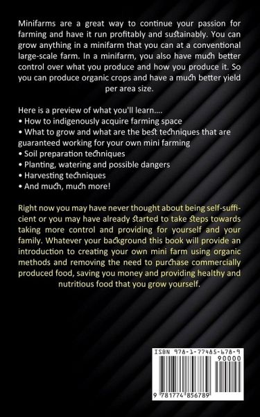 Minifarms are a great way to continue your passion for farming and have it run profitably and sustainably. You can grow anything in a minifarm that you can at a conventional large-scale farm. In a minifarm, you also have much better control over what you produce and how you produce it. So you can produce organic crops and have a much better yield per area size. Here is a preview of what you'll learn....How to indigenously acquire farming space What to grow and what are the best techniques that are guaranteed working for your own mini farming Soil preparation techniques Planting, watering and possible dangers Harvesting techniques And much, much more! Right now you may have never thought about being self-sufficient or you may have already started to take steps towards taking more control and providing for yourself and your family. Whatever your background this book will provide an introduction to creating your own mini farm using organic methods and removing the need to purchase commercially produced food, saving you money and providing healthy and nutritious food that you grow yourself.