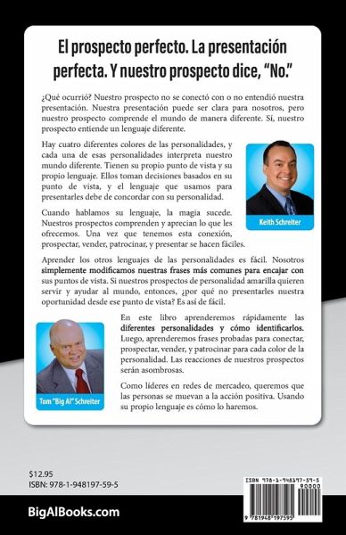El prospecto perfecto. La presentación perfecta. Y nuestro prospecto dice, "No." ¿Qué ocurrió? Nuestro prospecto no se conectó con o no entendió nuestra presentación. Nuestra presentación puede ser clara para nosotros, pero nuestro prospecto comprende el mundo de manera diferente. Sí, nuestro prospecto entiende un lenguaje diferente. Hay cuatro diferentes colores de las personalidades, y cada una de esas personalidades interpreta nuestro mundo diferente. Tienen su propio punto de vista y su propio lenguaje. Ellos toman decisiones basados en su punto de vista, y el lenguaje que usamos para presentarles debe de concordar con su personalidad. Cuando hablamos su lenguaje, la magia sucede. Nuestros prospectos comprenden y aprecian lo que les ofrecemos. Una vez que tenemos esta conexión, prospectar, vender, patrocinar, y presentar se hacen fáciles. Aprender los otros lenguajes de las personalidades es fácil. Nosotros simplemente modificamos nuestras frases más comunes para encajar con sus puntos de vista. Si nuestros prospectos de personalidad amarilla quieren servir y ayudar al mundo, entonces, ¿por qué no presentarles nuestra oportunidad desde ese punto de vista? Es así de fácil. En este libro aprenderemos rápidamente las diferentes personalidades y cómo identificarlos. Luego, aprenderemos frases probadas para conectar, prospectar, vender, y patrocinar para cada color de la personalidad. Las reacciones de nuestros prospectos serán asombrosas. Como líderes en redes de mercadeo, queremos que las personas se muevan a la acción positiva. Usando su propio lenguaje es cómo lo haremos.