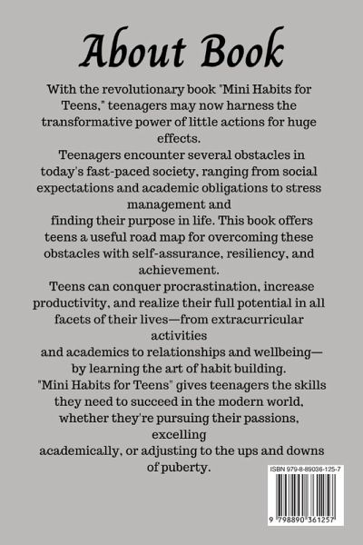 With the revolutionary book "Mini Habits for Teens," teenagers may now harness the transformative power of little actions for huge effects. Teenagers encounter several obstacles in today's fast-paced society, ranging from social expectations and academic obligations to stress management and finding their purpose in life. This book offers teens a useful road map for overcoming these obstacles with self-assurance, resiliency, and achievement. Teens can conquer procrastination, increase productivity, and realize their full potential in all facets of their lives-from extracurricular activities and academics to relationships and wellbeing-by learning the art of habit building. "Mini Habits for Teens" gives teenagers the skills they need to succeed in the modern world, whether they're pursuing their passions, excelling academically, or adjusting to the ups and downs of puberty.