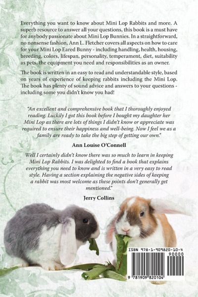 Everything you want to know about Mini Lop Rabbits and more. A superb resource to answer all your questions, this book is a must have for anybody passionate about Mini Lop Bunnies. In a straightforward, no nonsense fashion, Ann L. Fletcher covers all aspects on how to care for your Mini Lop Eared Bunny - including handling, health, housing, breeding, colors, lifespan, personality, temperament, diet, suitability as pets, the equipment you need and responsibilities as an owner. The book is written in an easy to read and understandable style, based on years of experience of keeping rabbits including the Mini Lop. The book is full of sound advice with wonderful color photos and answers to your questions - including some you didn't know you had!