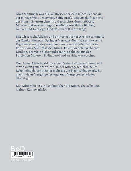 Alois Slominski war als Geistreisender Zeit seines Lebens in der ganzen Welt unterwegs. Seine große Leidenschaft gehörte der Kunst. Er erforschte ihre Geschichte, durchstöberte Museen und Ausstellungen, studierte unzählige Bücher, Artikel und Kataloge. Und das über 60 Jahre lang!Mit wissenschaftlicher und enthusiastischer Akribie sammelte der Denker des Axel Springer Verlages über Jahrzehnte seine Ergebnisse und präsentiert sie nun dem Kunstliebhaber in Form seines Mini Max der Kunst. Es ist ein detailverliebtes Lexikon, das viele bisher unbekannte Schätze aus den Bereichen Malerei, Bildhauerei und Architektur vereint.Von A wie Abendmahl bis zu Z wie Zeitungsleser hat Slomi wie er von allen genannt wurde, so der Kunstgeschichte neues Leben eingehaucht. Es ist mehr als ein Nachschlagewerk. Es macht vieles Vergangenes und auch Vergessenes wieder lebendig.Das Mini Max ist ein Lexikon über die Kunst, dass selbst ein kleines Kunstwerk ist.