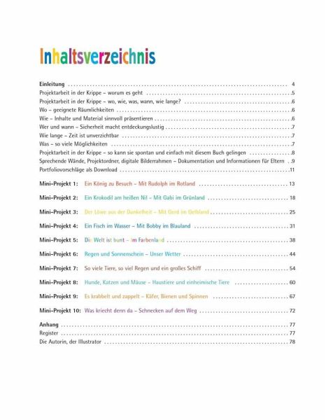 Projektarbeit schon in der Krippe? Na klar! Dieses Praxisbuch bietet 10 Mini-Projekte, die Sie im Handumdrehen mit Ihren Krippenkindern umsetzen können. Angebote rund um Farbexperimente, Schütt- und Fingerspiele, Basteln, Körpermassage und vieles mehr decken hier alle U3-Bildungsbereiche spielerisch ab. Die Projekte können einzeln oder kombiniert flexibel im Alltag eingesetzt werden - das eröffnet für Ihre pädagogische Krippenarbeit auch langfristig spannende Perspektiven. Natürlich fehlen auch einführende Informationen nicht, die Ihnen gleichzeitig als Basis für die Eltern-Info dienen. Ein Highlight für die Bildungsdokumentation: Zu jedem Projekt gibt es Portfolio-Textbausteine, die auch als Download verfügbar sind. Einfach übernehmen oder bequem auf Ihren Bedarf anpassen - das spart Zeit bei der Erstellung!