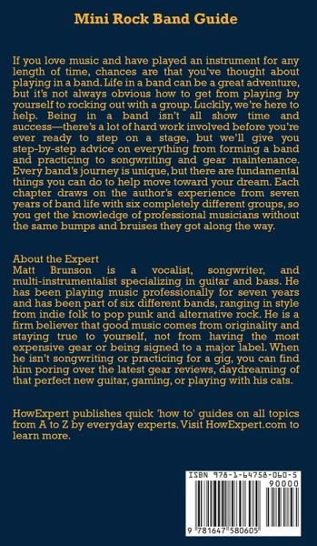 If you love music and have played an instrument for any length of time, chances are that you’ve thought about playing in a band. Life in a band can be a great adventure, but it’s not always obvious how to get from playing by yourself to rocking out with a group. Luckily, we’re here to help. Being in a band isn’t all show time and success—there’s a lot of hard work involved before you’re ever ready to step on a stage, but we’ll give you step-by-step advice on everything from forming a band and practicing to songwriting and gear maintenance. Every band’s journey is unique, but there are fundamental things you can do to help move toward your dream. Each chapter draws on the author’s experience from seven years of band life with six completely different groups, so you get the knowledge of professional musicians without the same bumps and bruises they got along the way. About the Expert Matt Brunson is a vocalist, songwriter, and multi-instrumentalist specializing in guitar and bass. He has been playing music professionally for seven years and has been part of six different bands, ranging in style from indie folk to pop punk and alternative rock. He is a firm believer that good music comes from originality and staying true to yourself, not from having the most expensive gear or being signed to a major label. When he isn’t songwriting or practicing for a gig, you can find him poring over the latest gear reviews, daydreaming of that perfect new guitar, gaming, or playing with his cats. HowExpert publishes quick 'how to' guides on all topics from A to Z by everyday experts.
