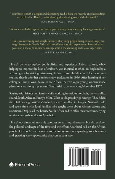 Hilary's desire to explore South Africa and experience African culture, while helping to improve the lives of children, was inspired at school in England by a sermon given by visiting missionary, Father Trevor Huddleston. Her dream was realized shortly after her physiotherapy graduation in 1966. After learning of her colleague Penny's own desire to see Africa, the two eager young women made plans for a year-long trip around South Africa, commencing November 1967. Staying with friends and family while working in various hospitals, they travelled round South Africa in Penny's Mini. What could possibly go wrong? They hiked the Drakensberg, visited Zululand, viewed wildlife in Kruger National Park, and spent time with local families who taught them about African culture and traditions. Despite all the beauty South Africa had to offer, there were underlying tensions everywhere due to Apartheid. Hilary's travel memoir not only recounts her exciting adventures, but also explores the political landscape of the time and the effects Apartheid had on the African people. Her book is a testament to the importance of expanding your horizons and grasping every opportunity that comes your way.
