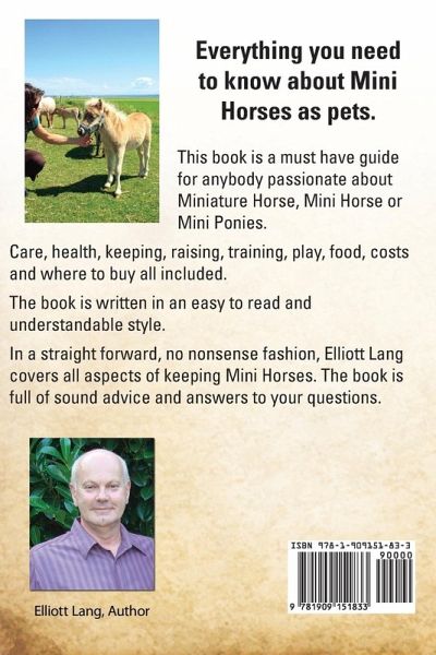 miniature horse Miniature Horse, Mini Horse, Mini Pony as Pets. Facts and Information. Miniature Horses Care, Health, Keeping, Raising, Training, Play, Food, Costs. Everything you need to know about Mini Horses as pets. This book is a must have guide for anybody passionate about Miniature Horse, Mini Horse or Mini Ponies. Care, health, keeping, raising, training, play, food, costs and where to buy all included.The book is written in an easy to read and understandable style.In a straight forward, no nonsense fashion, Elliott Lang covers all aspects of keeping Mini Horses. The book is full of sound advice and answers to your questions.