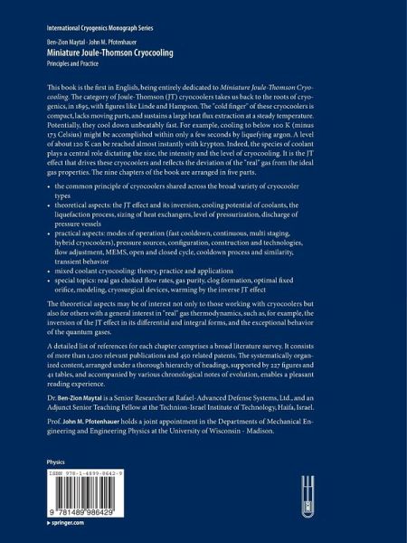 This book is the first in English being entirely dedicated to Miniature Joule-Thomson Cryocooling. The category of Joule-Thomson (JT) cryocoolers takes us back to the roots of cryogenics, in 1895, with figures like Linde and Hampson. The "cold finger" of these cryocoolers is compact, lacks moving parts, and sustains a large heat flux extraction at a steady temperature. Potentially, they cool down unbeatably fast. For example, cooling to below 100 K (minus 173 Celsius) might be accomplished within only a few seconds by liquefying argon. A level of about 120 K can be reached almost instantly with krypton. Indeed, the species of coolant plays a central role dictating the size, the intensity and the level of cryocooling. It is the JT effect that drives these cryocoolers and reflects the deviation of the "real" gas from the ideal gas properties. The nine chapters of the book are arranged in five parts.