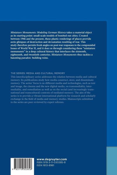 Miniature Monuments: Modeling German History offers a series of essays on small-scale models of bombed out cities. Created between 1946 and the present, these plastic renderings of places provide eerie glimpses of destruction and devastation resulting of the air war. This study thus permits fresh angles on post-war responses to the compounded losses of WW II, and it does so through considering these "miniature monuments?” (of, among others, Frankfurt, Munich, Schwetzingen, Heilbronn and Hiroshima) in a deep cultural history that interlaces the sixteenth, eighteenth, and twentieth centuries.