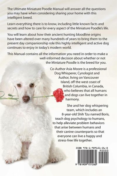 The Ultimate Miniature Poodle Manual will answer all the questions you may have when considering sharing your home with this intelligent breed. Learn everything there is to know, including little known facts and secrets and how to care for every aspect of the Miniature Poodle's life. You will learn about how their ancient hunting bloodline origins have been altered over many hundreds of years to bring them to the present day companionship role this highly intelligent and active dog continues to enjoy in today's modern world. This Manual contains all the information you need in order to make a well-informed decision about whether or not the Miniature Poodle is the breed for you. Co-Author Asia Moore is a professional Dog Whisperer, Cynologist and Author, living on Vancouver Island, off the west coast of British Columbia, in Canada, who believes that all humans and dogs can live together in harmony. She and her dog whispering team, which includes an 8-year-old Shih Tzu named Boris, teach dog psychology to humans, to help alleviate problem behaviors that arise between humans and their canine counterparts so that everyone can live a happy and stress-free life together.