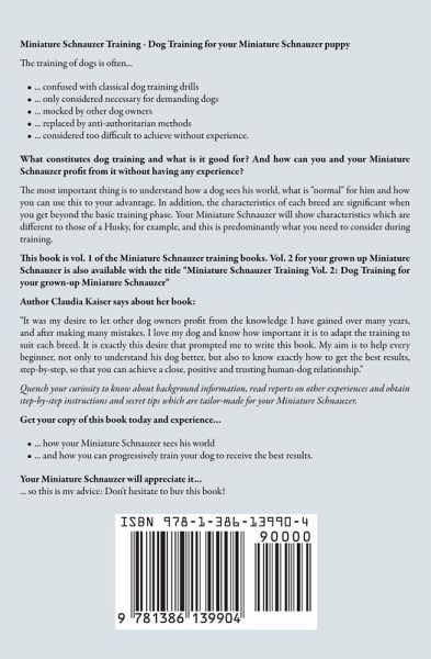 Miniature Schnauzer Training - Dog Training for your Miniature Schnauzer puppy The training of dogs is often...... confused with classical dog training drills ... only considered necessary for demanding dogs ... mocked by other dog owners ... replaced by anti-authoritarian methods ... considered too difficult to achieve without experience. What constitutes dog training and what is it good for? And how can you and your Miniature Schnauzer profit from it without having any experience? The most important thing is to understand how a dog sees his world, what is "normal" for him and how you can use this to your advantage. In addition, the characteristics of each breed are significant when you get beyond the basic training phase. Your Miniature Schnauzer will show characteristics which are different to those of a Husky, for example, and this is predominantly what you need to consider during training. This book is vol. 1 of the Miniature Schnauzer training books. Vol. 2 for your grown up Miniature Schnauzer is also available with the title "Miniature Schnauzer Training Vol. 2: Dog Training for your grown-up Miniature Schnauzer" Author Claudia Kaiser says about her book: "It was my desire to let other dog owners profit from the knowledge I have gained over many years, and after making many mistakes. I love my dog and know how important it is to adapt the training to suit each breed. It is exactly this desire that prompted me to write this book. My aim is to help every beginner, not only to understand his dog better, but also to know exactly how to get the best results, step-by-step, so that you can achieve a close, positive and trusting human-dog relationship." Quench your curiosity to know about background information, read reports on other experiences and obtain step-by-step instructions and secret tips which are tailor-made for your Miniature Schnauzer. Get your copy of this book today and experience...... how your Miniature Schnauzer sees his world ... and how you can progressively train your dog to receive the best results. Your Miniature Schnauzer will appreciate it... ... so this is my advice: Don't hesitate to buy this book! Content of this book:About the Author Preface What you need to know about your Miniature Schnauzer Cornerstones of training puppies Before the puppy arrives The first few weeks The first commands Training basic knowledge Special Chapter - The hunting instinct Check list for the start Conclusion