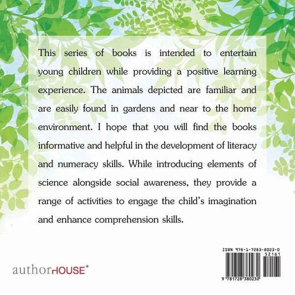This series of books is intended to entertain young children while providing a positive learning experience. The animals depicted are familiar and are easily found in gardens and near to the home environment. I hope that you will find the books informative and helpful in the development of literacy and numeracy skills. While introducing elements of science alongside social awareness, they provide a range of activities to engage the child's imagination and enhance comprehension skills.