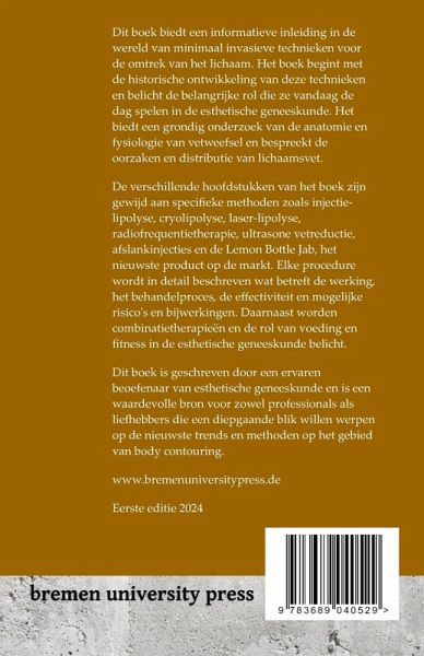 Dit boek biedt een informatieve inleiding in de wereld van minimaal invasieve technieken voor de omtrek van het lichaam. Het boek begint met de historische ontwikkeling van deze technieken en belicht de belangrijke rol die ze vandaag de dag spelen in de esthetische geneeskunde. Het biedt een grondig onderzoek van de anatomie en fysiologie van vetweefsel en bespreekt de oorzaken en distributie van lichaamsvet. De verschillende hoofdstukken van het boek zijn gewijd aan specifieke methoden zoals injectie-lipolyse, cryolipolyse, laser-lipolyse, radiofrequentietherapie, ultrasone vetreductie, afslankinjecties en de Lemon Bottle Jab, het nieuwste product op de markt. Elke procedure wordt in detail beschreven wat betreft de werking, het behandelproces, de effectiviteit en mogelijke risico's en bijwerkingen. Daarnaast worden combinatietherapieën en de rol van voeding en fitness in de esthetische geneeskunde belicht. Dit boek is geschreven door een ervaren beoefenaar van esthetische geneeskunde en is een waardevolle bron voor zowel professionals als liefhebbers die een diepgaande blik willen werpen op de nieuwste trends en methoden op het gebied van body contouring.