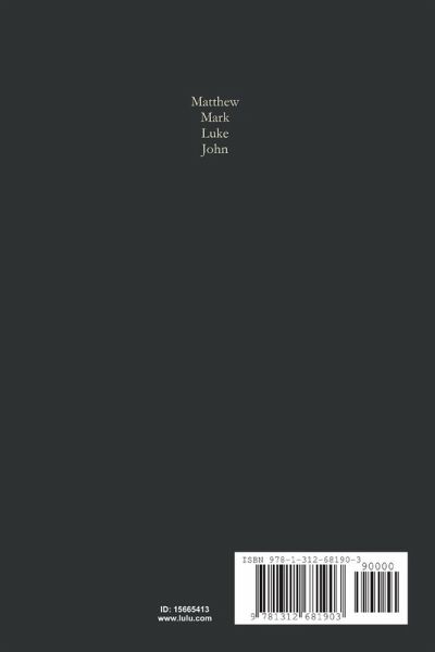 Book 6 Matthew - John. This is a Bible designed for reading. It has no verses, chapters, subheadings, or notes. It reads with the same style as popular novels with large font and thick paper. This adaption is best used to read and enjoy the Bible in a pure non-interrupting reading experience. The translation is derived from the World English Bible (WEB). No words or punctuation have been altered from the WEB. The WEB is a Public Domain (no copyright) Modern English translation of the Holy Bible. The World English Bible is based on the American Standard Version of the Holy Bible first published in 1901. Find out more at http://ebible.org/web/webfaq.htm. Please help me out by purchasing from http://www.lulu.com/spotlight/cblupo, Thank you. If you've previously purchased a print copy, contact me at chrisblupo@gmail.com and I'll send a free ebook version of the whole bible. Hardback versions are only available at Lulu.