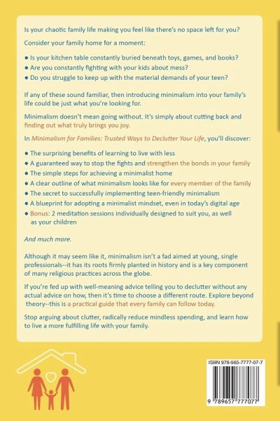 Is your chaotic family life making you feel like there's no space left for you? Consider your family home for a moment: Is your kitchen table constantly buried beneath toys, games, and books? Are you constantly fighting with your kids about mess? Do you struggle to keep up with the material demands of your teen? If any of these sound familiar, then introducing minimalism into your family's life could be just what you're looking for. Minimalism doesn't mean going without. It's simply about cutting back and finding out what truly brings you joy. In Minimalism for Families you'll discover: The surprising benefits of learning to live with less A guaranteed way to stop the fights and strengthen the bonds in your family The simple steps for achieving a minimalist home A clear outline of what minimalism looks like for every member of the family The secret to successfully implementing teen-friendly minimalism A blueprint for adopting a minimalist mindset, even in today's digital age Bonus: 2 meditation sessions individually designed to suit you, as well as your children And much more. If you're fed up with well-meaning advice telling you to declutter without any actual advice on how, then it's time to choose a different route. Explore beyond theory--this is a practical guide that every family can follow today. Stop arguing about clutter, radically reduce mindless spending, and learn how to live a more fulfilling life with your family.