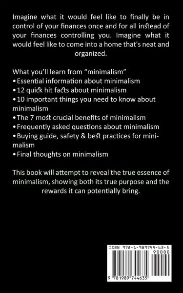 Imagine what it would feel like to finally be in control of your finances once and for all instead of your finances controlling you. Imagine what it would feel like to come into a home that's neat and organized. What you'll learn from "minimalism" ¿ Essential information about minimalism ¿ 12 quick hit facts about minimalism ¿ 10 important things you need to know about minimalism ¿ The 7 most crucial benefits of minimalism ¿ Frequently asked questions about minimalism ¿ Buying guide, safety & best practices for minimalism ¿ Final thoughts on minimalism This book will attempt to reveal the true essence of minimalism, showing both its true purpose and the rewards it can potentially bring.