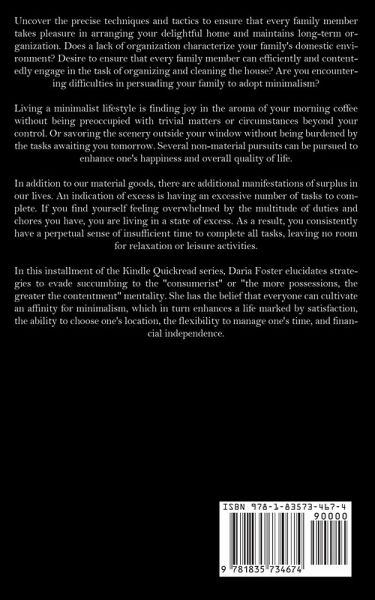 Uncover the precise techniques and tactics to ensure that every family member takes pleasure in arranging your delightful home and maintains long-term organization. Does a lack of organization characterize your family's domestic environment? Desire to ensure that every family member can efficiently and contentedly engage in the task of organizing and cleaning the house? Are you encountering difficulties in persuading your family to adopt minimalism? Living a minimalist lifestyle is finding joy in the aroma of your morning coffee without being preoccupied with trivial matters or circumstances beyond your control. Or savoring the scenery outside your window without being burdened by the tasks awaiting you tomorrow. Several non-material pursuits can be pursued to enhance one's happiness and overall quality of life. In addition to our material goods, there are additional manifestations of surplus in our lives. An indication of excess is having an excessive number of tasks to complete. If you find yourself feeling overwhelmed by the multitude of duties and chores you have, you are living in a state of excess. As a result, you consistently have a perpetual sense of insufficient time to complete all tasks, leaving no room for relaxation or leisure activities. In this installment of the Kindle Quickbeam series, Daria Foster elucidates strategies to evade succumbing to the "consumerist" or "the more possessions, the greater the contentment" mentality. She has the belief that everyone can cultivate an affinity for minimalism, which in turn enhances a life marked by satisfaction, the ability to choose one's location, the flexibility to manage one's time, and financial independence.