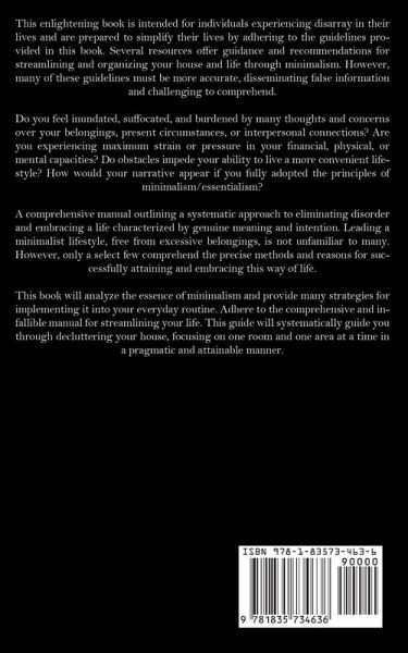 This enlightening book is intended for individuals experiencing disarray in their lives and are prepared to simplify their lives by adhering to the guidelines provided in this book. Several resources offer guidance and recommendations for streamlining and organizing your house and life through minimalism. However, many of these guidelines must be more accurate, disseminating false information and challenging to comprehend. Do you feel inundated, suffocated, and burdened by many thoughts and concerns over your belongings, present circumstances, or interpersonal connections? Are you experiencing maximum strain or pressure in your financial, physical, or mental capacities? Do obstacles impede your ability to live a more convenient lifestyle? How would your narrative appear if you fully adopted the principles of minimalism/essentialism? A comprehensive manual outlining a systematic approach to eliminating disorder and embracing a life characterized by genuine meaning and intention. Leading a minimalist lifestyle, free from excessive belongings, is not unfamiliar to many. However, only a select few comprehend the precise methods and reasons for successfully attaining and embracing this way of life. This book will analyze the essence of minimalism and provide many strategies for implementing it into your everyday routine. Adhere to the comprehensive and infallible manual for streamlining your life. This guide will systematically guide you through decluttering your house, focusing on one room and one area at a time in a pragmatic and attainable manner.