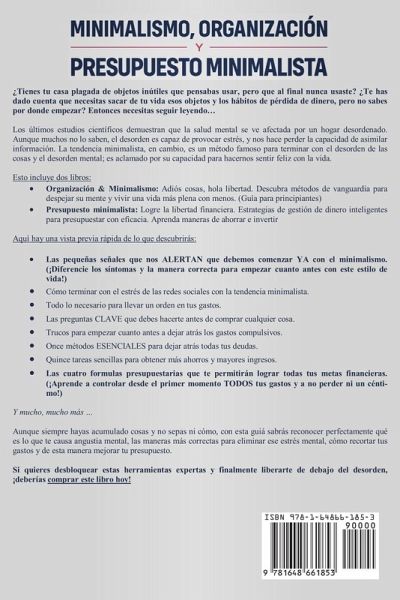 ¿Tienes tu casa plagada de objetos inútiles que pensabas usar, pero que al final nunca usaste? ¿Te has dado cuenta que necesitas sacar de tu vida esos objetos y los hábitos de pérdida de dinero, pero no sabes por donde empezar? Entonces necesitas seguir leyendo... Los últimos estudios científicos demuestran que la salud mental se ve afectada por un hogar desordenado. Aunque muchos no lo saben, el desorden es capaz de provocar estrés, y nos hace perder la capacidad de asimilar información. La tendencia minimalista, en cambio, es un método famoso para terminar con el desorden de las cosas y el desorden mental; es aclamado por su capacidad para hacernos sentir feliz con la vida. Esto incluye dos libros:Organización & Minimalismo: Adiós cosas, hola libertad. Descubra métodos de vanguardia para despejar su mente y vivir una vida más plena con menos. (Guía para principiantes) Presupuesto minimalista: Logre la libertad financiera. Estrategias de gestión de dinero inteligentes para presupuestar con eficacia. Aprenda maneras de ahorrar e invertir Aquí hay una vista previa rápida de lo que descubrirás:Las pequeñas señales que nos ALERTAN que debemos comenzar YA con el minimalismo. (¡Diferencie los síntomas y la manera correcta para empezar cuanto antes con este estilo de vida!) Cómo terminar con el estrés de las redes sociales con la tendencia minimalista. Todo lo necesario para llevar un orden en tus gastos. Las preguntas CLAVE que debes hacerte antes de comprar cualquier cosa. Trucos para empezar cuanto antes a dejar atrás los gastos compulsivos. Once métodos ESENCIALES para dejar atrás todas tus deudas. Quince tareas sencillas para obtener más ahorros y mayores ingresos. Las cuatro formulas presupuestarias que te permitirán lograr todas tus metas financieras. (¡Aprende a controlar desde el primer momento TODOS tus gastos y a no perder ni un céntimo!) ¿¿ Y mucho, mucho más ... Aunque siempre hayas acumulado cosas y no sepas ni cómo, con esta guiá sabrás reconocer perfectamente qué es lo que te causa angustia mental, las maneras más correctas para eliminar ese estrés mental, cómo recortar tus gastos y de esta manera mejorar tu presupuesto. Si quieres desbloquear estas herramientas expertas y finalmente liberarte de debajo del desorden, ¡deberías comprar este libro hoy!