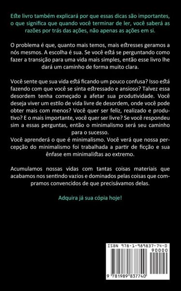 Este livro também explicará por que essas dicas são importantes, o que significa que quando você terminar de ler, você saberá as razões por trás das ações, não apenas as ações em si. O problema é que, quanto mais temos, mais estresses geramos a nós mesmos. A escolha é sua. Se você está se perguntando como fazer a transição para uma vida mais simples, então esse livro lhe dará um caminho de forma muito clara. Você sente que sua vida está ficando um pouco confusa? Isso está fazendo com que você se sinta estressado e ansioso? Talvez essa desordem tenha começado a afetar sua produtividade. Você deseja viver um estilo de vida livre de desordem, onde você pode obter mais com menos? Você quer ser feliz, realizado e produtivo? E o mais importante, você quer ser livre? Se você respondeu sim a essas perguntas, então o minimalismo será seu caminho para o sucesso. Você aprenderá o que é minimalismo. Você verá que nossa percepção do minimalismo foi trabalhada a partir de ficção e sua ênfase em minimalistas ao extremo. Acumulamos nossas vidas com tantas coisas materiais que acabamos nos sentindo vazios e dominados pelas coisas que compramos convencidos de que precisávamos delas. Adquira já sua cópia hoje!