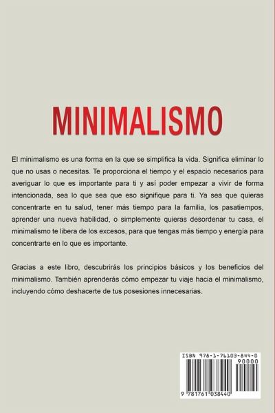 Minimalismo El minimalismo es una forma de simplificar la vida. Significa eliminar lo que no usas o necesitas. Te proporciona el tiempo y el espacio necesarios para averiguar qué es importante para ti, de modo que puedas empezar a vivir intencionadamente, sea lo que sea lo que eso signifique para ti. Si quieres centrarte en tu salud, tener más tiempo para tu familia, tus aficiones, aprender una nueva habilidad, o simplemente quieres desordenar tu casa, el minimalismo te libera de los excesos, para que tengas más tiempo y energía para centrarte en lo que es importante. En este libro descubrirás los principios básicos y los beneficios del minimalismo. También aprenderás cómo empezar tu viaje minimalista, ¡incluyendo cómo deshacerte de tus posesiones innecesarias!