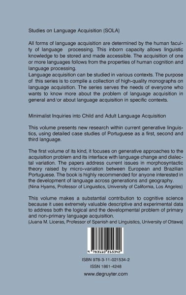 This volume brings together chapters written by specialists in North America, Europe and Brazil. It includes original research about the acquisition (L1, bilingualism) and acquisition/ learning (L2 or L3) of dialects of Brazilian and European Portuguese. In an effort to maximize volume cohesion, the emphasis has been on contributions that present studies exploring both empirical/experimental and theoretical aspects of the acquisition of syntax, and its interfaces with morphology, with semantics/pragmatics, and with language change.