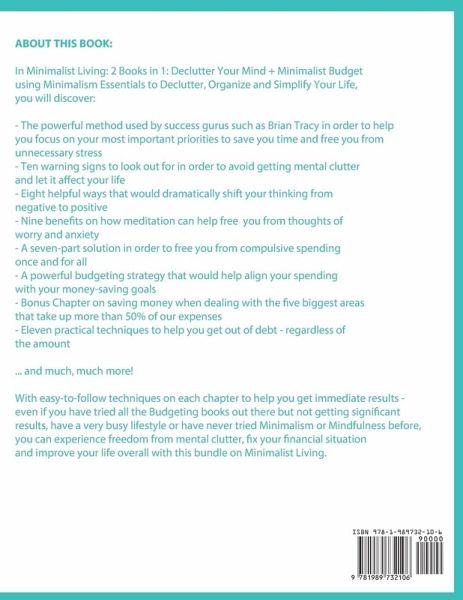 If you want to know how this new, proven revolutionary lifestyle can help free you from worry, stress and financial problems in while helping you live a healthier life, keep reading... In Minimalist Living: 2 Books in 1: Declutter Your Mind + Minimalist Budget using Minimalism Essentials to Declutter, Organize and Simplify Your Life, you will discover: The powerful method used by success gurus such as Brian Tracy in order to help you focus on your most important priorities to save you time and free you from unnecessary stress Ten warning signs to look out for in order to avoid getting mental clutter and let it affect your life Eight helpful ways that would dramatically shift your thinking from negative to positive Nine benefits on how meditation can help free you from thoughts of worry and anxiety How to get more done in less time to avoid getting overwhelmed mentally and physically Seven strategies that are easy to implement for achieving the necessary work-life balance How to effectively declutter your home to free up more space and provide a better stress-free environment The benefits of a less is more minimalist lifestyle and how to start freeing yourself from things you don't really need A Bonus Chapter on being free from Digital Clutter - featuring eight proven ways on how to achieve digital decluttering and not let all the noise affect you The main reason why your mind is filled with so much clutter - and how you can fix it Eight simple ways you can apply instantly to start saving money How to dramatically shift your thinking from a negative mindset to a positive one when it comes to money Six strategies you can use in order to budget the right way Easy steps on how you can come up with a financial plan that lets you both save more and earn more A seven-part solution in order to free you from compulsive spending once and for all A powerful budgeting strategy that would help align your spending with your money-saving goals Bonus Chapter on saving money when dealing with the five biggest areas that take up more than 50% of our expenses Eleven practical techniques to help you get out of debt - regardless of the amount ... and much, much more! With easy-to-follow techniques on each chapter to help you get immediate results - even if you have tried all the Budgeting books out there but not getting significant results, have a very busy lifestyle or have never tried Minimalism or Mindfulness before, you can experience freedom from mental clutter, fix your financial situation and improve your life overall with this bundle on Minimalist Living. So if you want to experience stress-free living and get relief from both mental and digital clutter and financial issues this year, click the "Buy Now" button to get started.