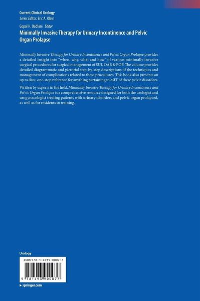 Written by experts in the field, Minimally Invasive Therapy for Urinary Incontinence and Pelvic Organ Prolapse is a comprehensive resource designed for both the urologist and urogynecologist treating patients with urinary disorders and pelvic organ prolapsed, as well as for residents in training.