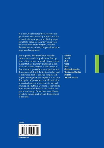 This superbly illustrated book provides authoritative and comprehensive descriptions of the various minimally invasive techniques that are currently employed in thoracic and cardiac surgery. A wide range of thoracoscopic procedures are explained and discussed, and detailed attention is also paid to robotic and robot-assisted surgical techniques. Throughout, the emphasis is on clear description of procedures and identification of practical aspects of relevance in surgical practice. The authors are some of the world's most experienced thoracic and cardiac surgeons, and many of them have contributed greatly to the exploration and development of the field.