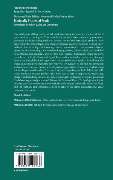 The safety and efficacy of minimal food processing depends on the use of novel preservation technologies. This book first examines what is meant by minimally processed foods, including fresh-cut, cooked-chilled, and part-baked products. Next explored are the technologies or methods to produce quality products in terms of safety and nutrition, including: edible coating, natural preservatives (i.e., antimicrobial, flavour enhancer, anti-browning), advanced packaging (active, antimicrobial, and modified or controlled atmosphere), and selected non-thermal techniques (high pressure, pulsed electric field, ultrasound, light). Preservation of food is crucial to achieving a secure and safe global food supply with the desired sensory quality. In addition, the increasing consumer demand for safe, ready-to-serve, ready-to-eat-and-cook products with minimal chemical preservatives has raised expectations. However, foods deemed minimally processed, such as fresh-cut fruits and vegetables,cooked-chilled, and half-baked foods, are delicate products that need special care in preparation, processing, storage, and handling. As a result, new technologies to develop minimally processed foods have aggressively advanced. Minimally Processed Foods: Technologies for Safety, Quality, and Convenience explores both the definition of minimally processed foods and the methods and technologies used to achieve the safety and nutritional value consumers demand.