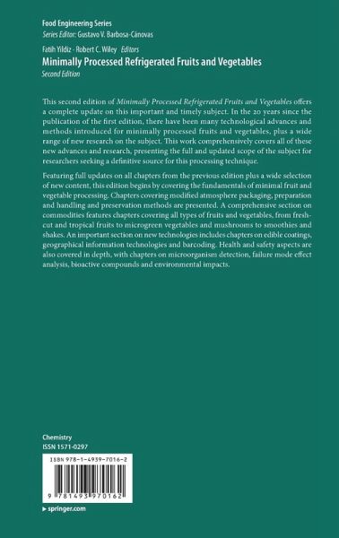Part 1. Fundamentals.- Chapter 1. Introduction to Minimally Processed Refrigerated (MPR) Fruits & Vegetables.- Chapter 2. Aspects of Biology and Physics Underlying Modified Atmosphere Packaging.- Chapter 3. Initial Preparation Handling, and Distribution of Minimally Processed Refrigerated Fruit and Vegetables.- Chapter 4. Enzymes in Minimally Processed Fruits and Vegetables.- Chapter 5. Biological and Biochemical Changes in Minimally Processed Refrigerated Fruits and Vegetables.- Chapter 6.Preservation Methods for Minimally Processed Refrigerated Fruits and Vegetables.- Chapter 6. Packaging and Preservation of Minimally Processed Refrigerated Produce.- Part 2. Commodities.- Chapter 8. Postharvest Quality and Safety of Fresh-cut Vegetables.- Chapter 9. Fresh-cut Fruits.- Chapter10. Minimally processed herbs, spices, medicinal and aromatic, plants.- Chapter 11. Sprouts, Microgreens, and Baby leafs.- Chapter 12. Minimally Processed Mushrooms.- Chapter 13. Minimal Processing of Tropical and Subtropical Fruits, Vegetables, Nuts and seeds.- Chapter 14. Minimally processed fresh green beverage industry: Smoothies, Shakes and Frappes.- Chapter 15. Fermented Vegetables.- Part 3. New Technologies.- Chapter 16. New Technologies and Edible Coatings for MPR Fruits and Vegetables.- Chapter 17. Use of Geographical Information Technologies in a Precision Agriculture Management System for Food Traceability.- Chapter 18. DNA Barcoding for MPR Fruits and Vegetables.- Part 4. Health and Food Safety.- Chapter 19. Microorganisms Found in/on of MPR Packaged Produce and Their Detection Methods.- Chapter 20. Comparison of HACCP and ISO 22000 in the ready to eat fruit and vegetable Industry in conjunction with application of Failure Mode and Effect Analysis (FMEA) and Ishikawa diagrams.- Chapter 21. Health and Physiological Bioactive Compounds in Fruits and Vegetables.- Chapter 22. Environmental Impacts of Minimally Processed Refrigerated Fruits and Vegetables Industry.
