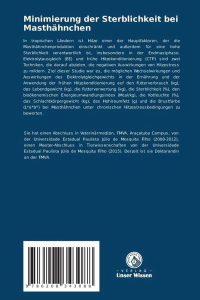 In tropischen Ländern ist Hitze einer der Hauptfaktoren, der die Masthähnchenproduktion einschränkt und außerdem für eine hohe Sterblichkeit verantwortlich ist, insbesondere in der Endmastphase. Elektrolytausgleich (EE) und frühe Hitzekonditionierung (CTP) sind zwei Techniken, die darauf abzielen, die negativen Auswirkungen von Hitzestress zu mildern. Ziel dieser Studie war es, die möglichen Wechselwirkungen und Auswirkungen des Elektrolytgleichgewichts in der Ernährung und der Anwendung der frühen Hitzekonditionierung auf den Futterverbrauch (kg), das Lebendgewicht (kg), die Futterverwertung (kg), die Sterblichkeit (%), den bioökonomischen Energieumwandlungsindex (Mcal/kg), die Kotfeuchte (%), das Schlachtkörpergewicht (kg), das Hohlraumfett (g) und die Brustfarbe (L_a_b_) bei Masthähnchen unter chronischen Hitzestressbedingungen zu bewerten.