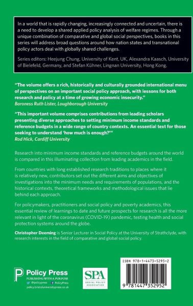Research into minimum income standards and reference budgets around the world is compared in this illuminating collection from leading academics in the field. From countries with long established research traditions to places where it is relatively new, contributors set out the different aims and objectives of investigations into the minimum needs and requirements of populations, and the historical contexts, theoretical frameworks and methodological issues that lie behind each approach.