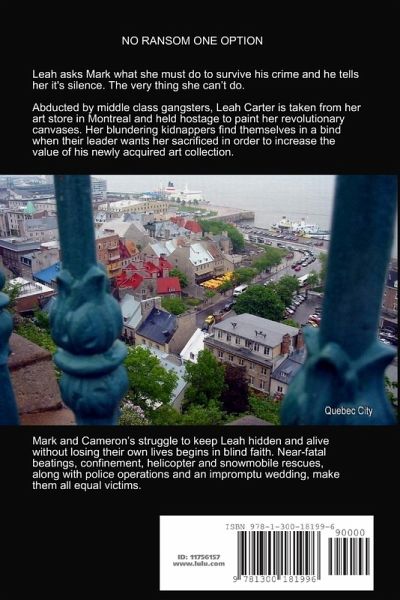 NO RANSOM ONE OPTION: Leah asks Mark what she must do to survive his crime and he tells her it's silence. The very thing she can't do. Abducted by middle class gangsters, Leah Carter is taken from her art store in Montreal and held hostage to paint her revolutionary canvases. Her blundering kidnappers find themselves in a bind when their leader wants her sacrificed in order to increase the value of his newly acquired art collection. Mark and Cameron's struggle to keep Leah hidden and alive without losing their own lives begins in blind faith. Near-fatal beatings, confinement, helicopter and snowmobile rescues, along with police operations and an impromptu wedding, make them all equal victims.