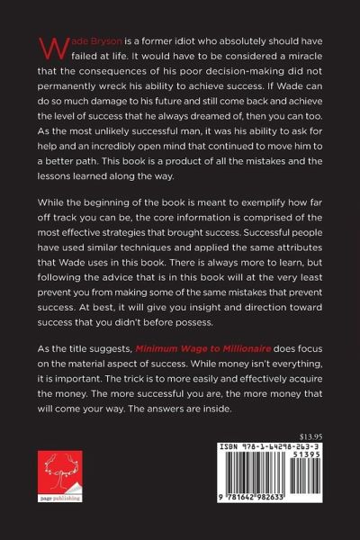 Wade Bryson is a former idiot who absolutely should have failed at life. It would have to be considered a miracle that the consequences of his poor decision-making did not permanently wreck his ability to achieve success. If Wade can do so much damage to his future and still come back and reach the level of success, than you can too. As the most unlikely successful man, it was his ability to ask for help and an incredibly open mind that continued to move him to a better path. This book is a product of all the mistakes and the lessons learned along the way. While the beginning of the book is meant to exemplify how far off track you can be, the core information is comprised of the most effective strategies that brought success. Successful people have used similar techniques and applied the same attributes that Wade uses in this book. There is always more to learn, but following the advice that is in this book will at the very least prevent you from making some of the same mistakes that prevent success. At best, it will give you insight and direction toward success that you didn't before possess. As the title suggests, Minimum Wage to Millionaire does focus on the material aspect of success. While money isn't everything, it is important. The trick is to more easily and effectively acquire the money. The more successful you are, the more money that will come your way. The answers are inside.