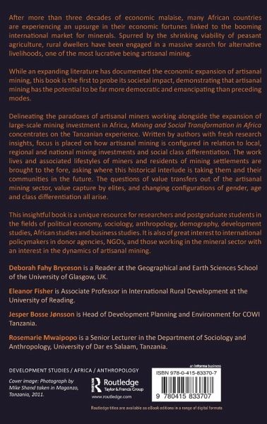 After more than three decades of economic malaise, many African countries are experiencing an upsurge in their economic fortunes linked to the booming international market for minerals. Spurred by the shrinking viability of peasant agriculture, rural dwellers have been engaged in a massive search for alternative livelihoods, one of the most lucrative being artisanal mining. While an expanding literature has documented the economic expansion of artisanal mining, this book is the first to probe its societal impact, demonstrating that artisanal mining has the potential to be far more democratic and emancipating than preceding modes. Delineating the paradoxes of artisanal miners working alongside the expansion of large-scale mining investment in Africa, Mining and Social Transformation in Africa concentrates on the Tanzanian experience. Written by authors with fresh research insights, focus is placed on how artisanal mining is configured in relation to local, regional and national mining investments and social class differentiation. The work lives and associated lifestyles of miners and residents of mining settlements are brought to the fore, asking where this historical interlude is taking them and their communities in the future. The question of value transfers out of the artisanal mining sector, value capture by elites and changing configurations of gender, age and class differentiation, all arise.