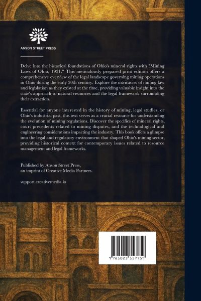 Delve into the historical foundations of Ohio's mineral rights with "Mining Laws of Ohio, 1921." This meticulously prepared print edition offers a comprehensive overview of the legal landscape governing mining operations in Ohio during the early 20th century. Explore the intricacies of mining law and legislation as they existed at the time, providing valuable insight into the state's approach to natural resources and the legal framework surrounding their extraction. Essential for anyone interested in the history of mining, legal studies, or Ohio's industrial past, this text serves as a crucial resource for understanding the evolution of mining regulations. Discover the specifics of mineral rights, court precedents related to mining disputes, and the technological and engineering considerations impacting the industry. This book offers a glimpse into the legal and regulatory environment that shaped Ohio's mining sector, providing historical context for contemporary issues related to resource management and legal frameworks. This work has been selected by scholars as being culturally important, and is part of the knowledge base of civilization as we know it. This work is in the public domain in the United States of America, and possibly other nations. Within the United States, you may freely copy and distribute this work, as no entity (individual or corporate) has a copyright on the body of the work. Scholars believe, and we concur, that this work is important enough to be preserved, reproduced, and made generally available to the public. We appreciate your support of the preservation process, and thank you for being an important part of keeping this knowledge alive and relevant.