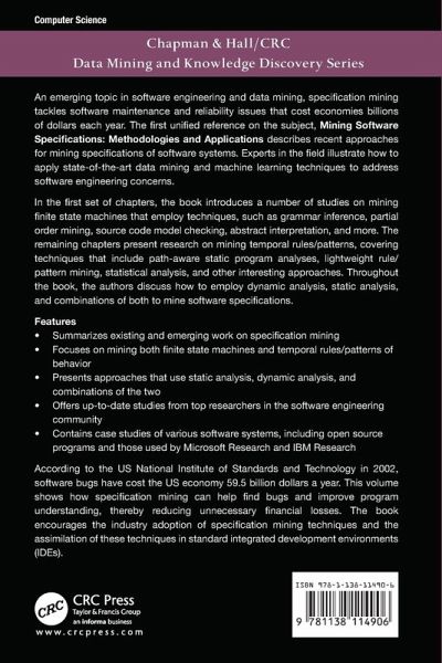 An emerging topic in software engineering and data mining, specification mining tackles software maintenance and reliability issues that cost economies billions of dollars each year. The first unified reference on the subject, Mining Software Specifications: Methodologies and Applications describes recent approaches for mining specifications of software systems. Experts in the field illustrate how to apply state-of-the-art data mining and machine learning techniques to address software engineering concerns. In the first set of chapters, the book introduces a number of studies on mining finite state machines that employ techniques, such as grammar inference, partial order mining, source code model checking, abstract interpretation, and more. The remaining chapters present research on mining temporal rules/patterns, covering techniques that include path-aware static program analyses, lightweight rule/pattern mining, statistical analysis, and other interesting approaches. Throughout the book, the authors discuss how to employ dynamic analysis, static analysis, and combinations of both to mine software specifications. According to the US National Institute of Standards and Technology in 2002, software bugs have cost the US economy 59.5 billion dollars a year. This volume shows how specification mining can help find bugs and improve program understanding, thereby reducing unnecessary financial losses. The book encourages the industry adoption of specification mining techniques and the assimilation of these techniques in standard integrated development environments (IDEs).