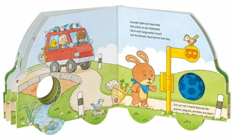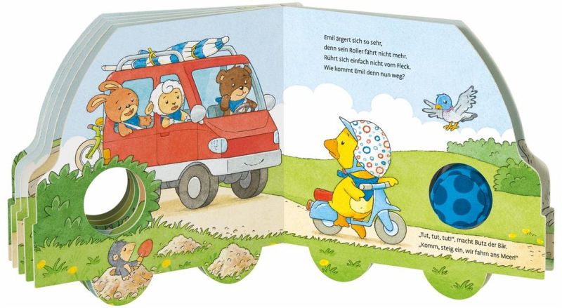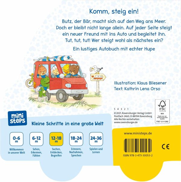 "Tut! Tut! Tut!", macht Butz der Bär und ruft: "Komm, steig ein, wir fahrn ans Meer!" Und so springt auf jeder Seite im Buch ein weiterer Freund zu Butz ins Auto. Besonderer Spaß dabei: Das Kind kann auf jeder Seite auf die Hupe drücken. Das ist lustig und schult spielerisch die Motorik der Kleinen!
