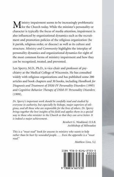 Ministry impairment seems to be increasingly problematic for the Church today. While the minister's personality or character are typically the focus of media attention, impairment is also influenced by organizational dynamics such as the recruitment and promotion policies of the religious organization as well as its culture and structure. Ministry and Community highlights the interplay of personality dynamics and organizational dynamics for eight of the most common forms of ministry impairment and shows how they can be recognized, treated, and prevented. In Ministry and Community Len Sperry looks at the dynamics underlying and supporting narcissistic behavior, sexual abusing behavior, psychopathic behavior, borderline behavior, depressive behavior, obsessive-compulsive behavior, manic-depressive behavior, and passive-aggressive behavior in ministry personnel. He then describes a number of effective strategies that can modify these individual and organizational dynamics. Rather than affix blame on ministers or the Church, this book offers a series of observations on concerns faced by the Church and provides suggestions for addressing these concerns. Ministry and Community also offers a measure of hopefulness about the prospects for professional ministry in the Church. These suggestions include specific criterion for determining fitness for ministry, guidelines for realistically appraising ministry performance, and specific indications and contraindications for psychotherapy and other psychiatric interventions.