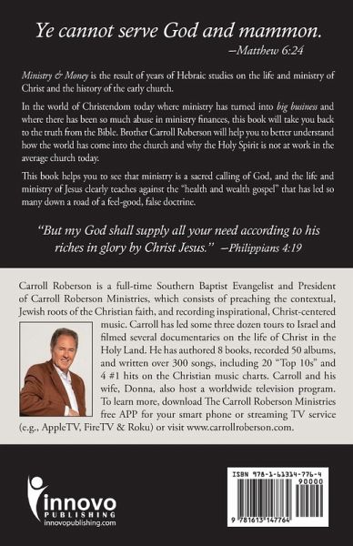 "Ye cannot serve God and mammon." -Matthew 6:24 Ministry & Money is the result of years of Hebraic studies on the life and ministry of Christ and the history of the early church. In the world of Christendom today where ministry has turned into big business and where there has been so much abuse in ministry finances, this book will take you back to the truth from the Bible. Brother Carroll Roberson will help you to better understand how the world has come into the church and why the Holy Spirit is not at work in the average church today. This book helps you to see that ministry is a sacred calling of God, and the life and ministry of Jesus clearly teaches against the "health and wealth gospel" that has led so many down a road of a feel-good, false doctrine. "But my God shall supply all your need according to his riches in glory by Christ Jesus." -Philippians 4:19) - ABOUT THE AUTHOR: Carroll Roberson is a full-time Southern Baptist Evangelist and President of Carroll Roberson Ministries, which consists of preaching the contextual, Jewish roots of the Christian faith, and recording inspirational, Christ-centered music. Carroll has led some three dozen tours to Israel and filmed several documentaries on the life of Christ in the Holy Land. He has authored 8 books, recorded 50 albums, and written over 300 songs, including 20 "Top 10s" and 4 #1 hits on the Christian music charts. Carroll and his wife, Donna, also host a worldwide television program. To learn more, download The Carroll Roberson Ministries free APP for your smartphone or streaming TV service (e.g., AppleTV, FireTV & Roku) or visit www.carrollroberson.com. - ABOUT THE PUBLISHER: Innovo Publishing LLC is a Christian publisher located near Memphis, TN. Since 2008, Innovo has been publishing quality books, eBooks, audiobooks, music, screenplays, film, and online and physical curricula that support the Great Commission, equip Believers, and help create a positive Christian worldview. Innovo's capabilities and global reach provide Christian authors, artists and ministries access to the world for Christ. To learn more about Innovo Publishing visit our website at innovopublishing.com, and to learn "everything you've always wanted to know about creating, publishing, marketing, and selling Christian titles," - visit the Christian Publishing Portal at cpportal.com.